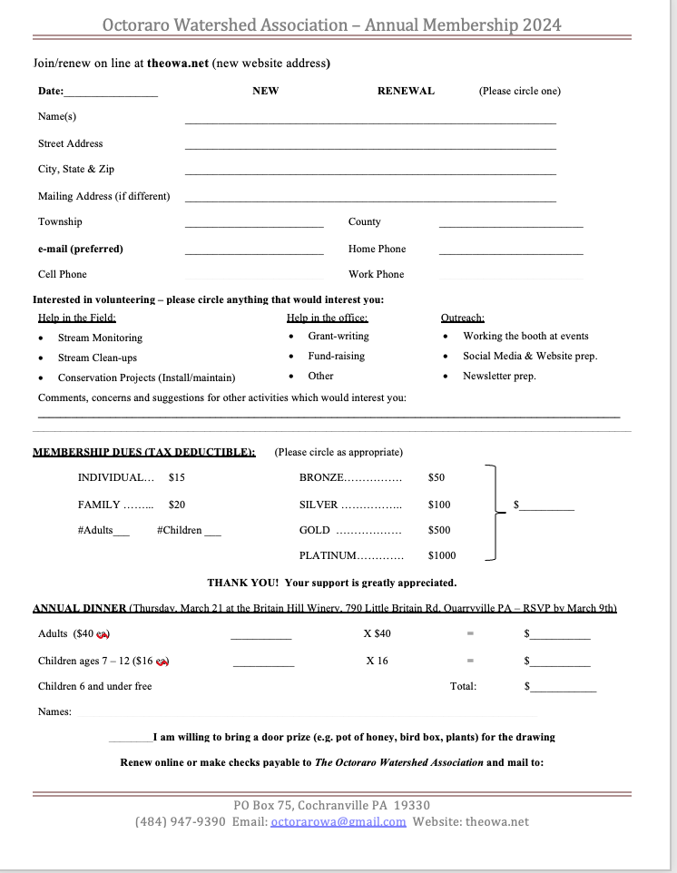 PO Box 75, Cochranville, PA 19330 (484) 947 - 9390 octorarowa@gmail.com