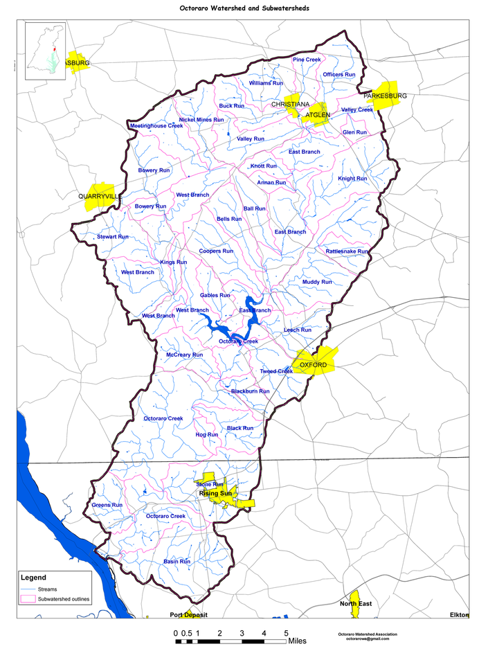 The Octoraro Watershed is located on the eastern margin of the Chesapeake Bay Watershed, with its headwaters in Lancaster and Chester Counties, Pennsylvania, and an outfall into the Lower Susquehanna in Cecil County, Maryland.